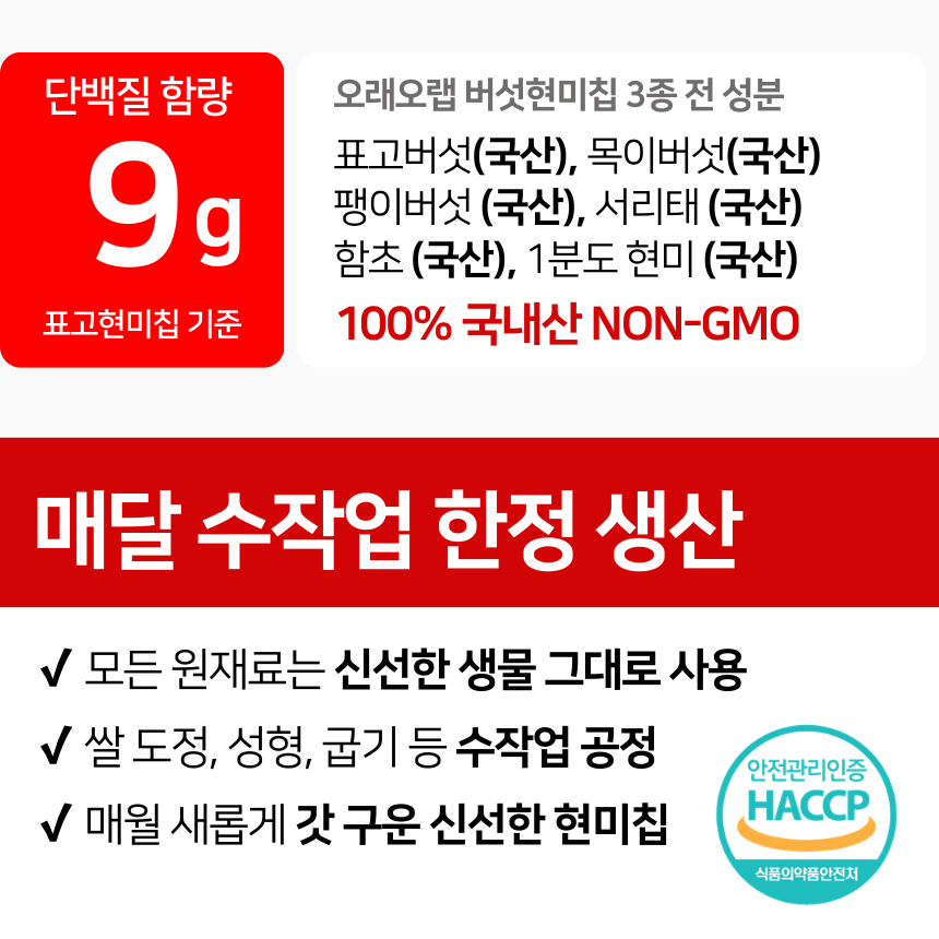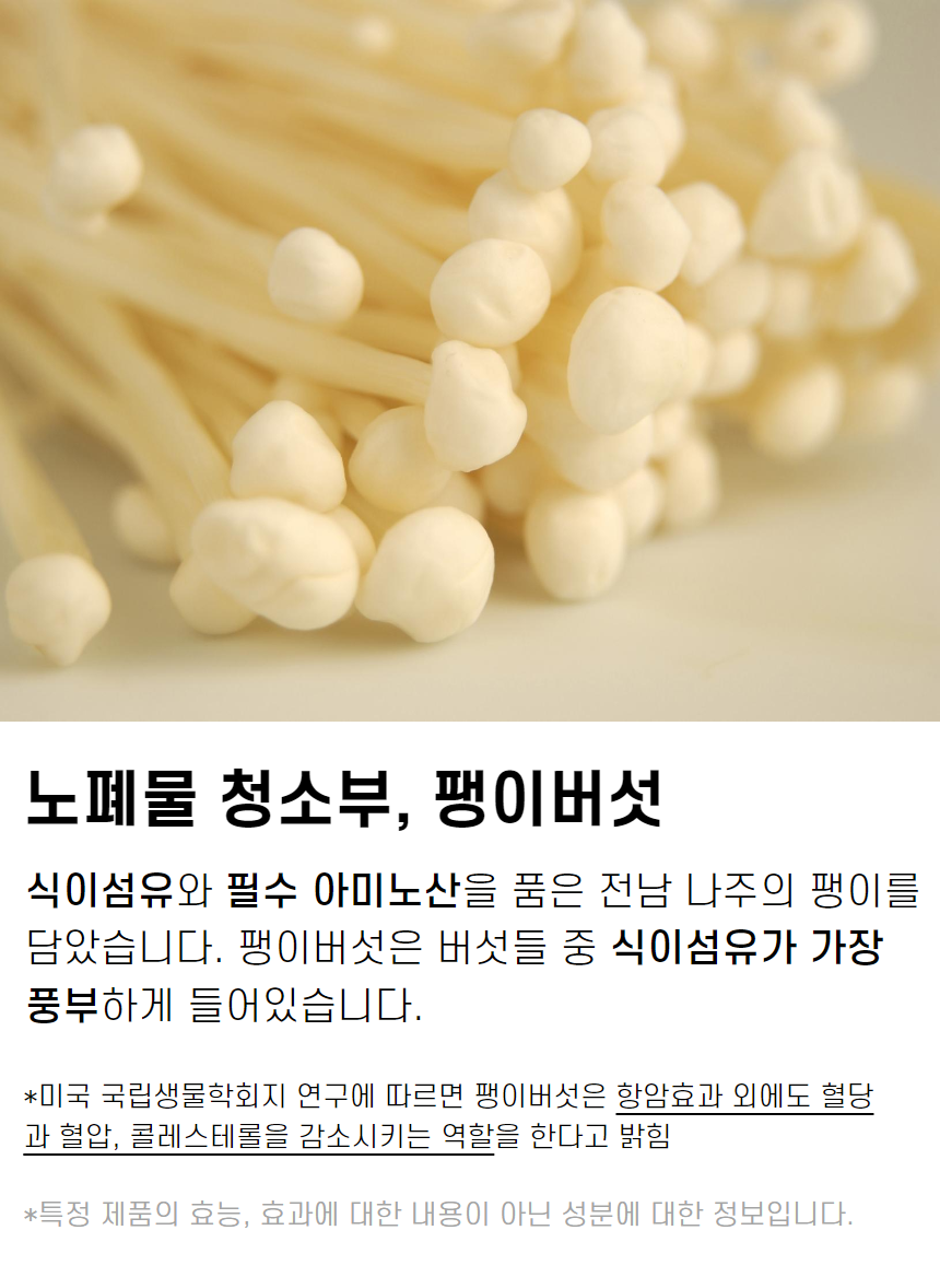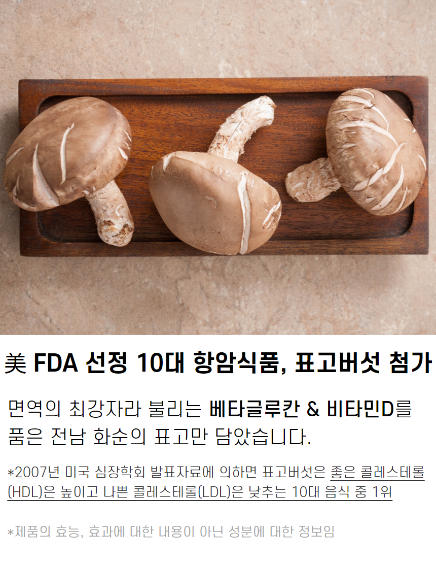 ▶︎ 전 성분 : 표고버섯(국산), 목이버섯(국산), 팽이버섯 (국산), 서리태 (국산), 함초 (국산), 1분도 현미 (국산)
