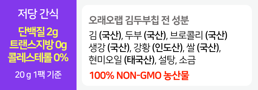 ▶︎ 전 성분 : 김 (국산), 두부 (국산), 브로콜리 (국산), 생강 (국산), 강황 (인도산), 쌀 (국산), 현미오일 (태국산), 설탕, 소금